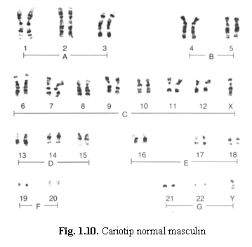 Pe baza taliei si pozitiei centromerului, cromozomii au fost clasificati in 7 grupe, notate de la A la G; fiecare cromozom somatic este desemnat printr-un numar de la 1 la 22 (figura 1.10). Se obtine astfel o aranjare sistematizata a cromozomilor unei celule numita cariotip .