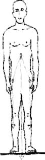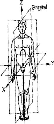 a ) Axele de orientare sunt: axa longitudinala, sagitala si transversala. Axa longitudinala este dreapta care uneste crestetul capului (vertexul) cu centrul poligonului de sustinere format din suprafata talpilor, cu calcaiele lipite. Ea nu este axa de simetrie. Axa sagitala este axa grosimii corpului. Ea trece prin centrul de greutate al corpului, care este localizat la nivelul celei de-a doua vertebre lombare. Axa transversala corespunde latimii corpului si trece tot prin centrul de greutate (fig. 2).