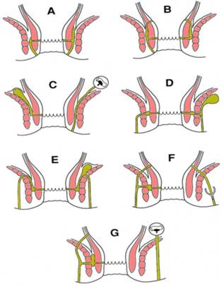 Fig. 3 - Clasificarea fistulelor perianale (Parks): intersfincteriana simpla (A); intersfincteriana cu deschidere rectala sau/si perianala (B); fistule intersfincteriene, cu extensie extrarectala, secundare unor boli pelvine (C); fistule transsfincteriene (D); fistule suprasfincteriene (E); fistule extrasfincteriene (F); fistule extrasfincteriene secundare unor boli anorectale sau unor inflamatii pelvine (G) (3)
