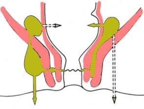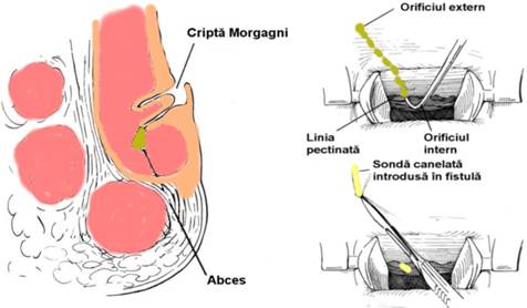 Majoritatea fistulelor perianale provin dintr-o infectie a criptelor extinsa la musculatura perianala si tesuturile perirectale. Extirparea fistulei perianale se face in absenta abcesului si in conditiile unei stari generale bune a pacientului. Este foarte importanta explorarea corecta a fistulei si, mai ales, a aparatului sfincterian. Sfincterul extern superficial se palpeaza ca o banda care inconjoara canalul anal imediat sub piele. Deasupra benzii se gaseste o usoara depresiune - linia intersfincteriana, punct de reper pentru identificarea capatului terminal al sfincterului intern. O fistula anterioara care intereseaza numai tesutul celular subcutanat sau portiunea superficiala a sfincterului extern poate fi excizata fara probleme deoarece incontinenta nu apare, iar ridicatorul anal si sfincterul extern se mentin intacte. O fistula anterioara care intereseaza intreg sfincterul extern nu poate fi excizata intr-o singura sedinta deoarece exista riscul incontinentei. Posterior, daca ridicatorul anal ramane intact si fistula intereseaza intreg sfincterul extern se poate practica excizia completa cu risc minim de incontinenta. Cele mai multe fistule provin din glandele anale de la baza criptelor Morgagni si abcesele patrund in sfincterul intern (Fig. 5); infectia se propaga in planul tisular creat de septul fibromuscular al musculaturii longitudinale.