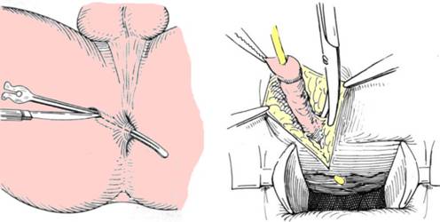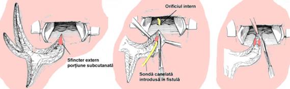 Orificiul intern al fistulei este identificat si in acesta se introduce o sonda canelata curbata; unul din orificiile externe este cateterizat si colorat cu albastru de metilen, apoi se introduce o sonda canelata pe care se excizeaza traiectul cat mai mult posibil.