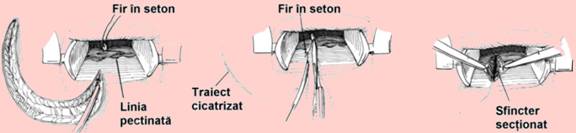 in fistulele intrasfincteriene si transsfincteriene joase este posibila sectiunea partiala si unilaterala a sfincterului neted sau a sfincterului striat, care sa nu depaseasca in adancime 1-2 cm; sfincterotomia partiala nu trebuie realizata bilateral, ci in sens radiar, perpendicular pe orificiul anal, iar sfincterul nu trebuie sa fie inflamat;