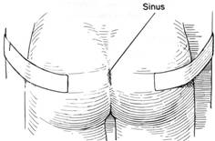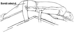 Pentru interventie, pacientul este asezat in decubit ventral, pe masa de operatie rupta la mijloc. Pentru o mai buna expunere a sinusului pilonidal, se prind doua benzi adezive in regiunea fesiera, la 10 cm de linia mediana, care se fixeaza apoi pe masa (Fig. 11).