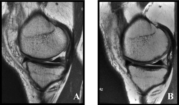 Fig.34. A-scanare inaintea microfracturarii, B-scanare la patru luni dupaa microfracturare.