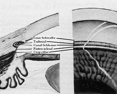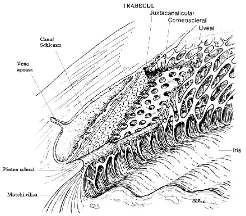 - trabeculul corneoscleral - este localizat intre trabeculul uveal si cel cribriform; aici spatiile intertrabeculare sunt mai mici, dar nu jeneaza scurgerea umorii apoase ;