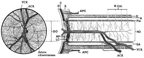 (ACR -artera centrala a retinei, VCR - vena centrala a retinei, R-retina, C-coroida, S-sclera, DO-disc optic, D-dura mater, A-arahnoida, Pia - pia mater, NO -nerv optic, SA-spatiu subarahnoidian, Rcol-ramuri colaterale, DO- disc optic, APC- artere ciliare posterioare)