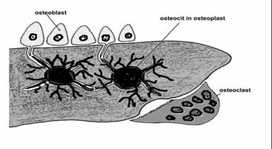 osteocite, celule adulte , stelate, cu prelungiri, adapostite in niste cavitati ce au forma celulei osoase, sapate in substanta fundamentala, numite osteoplaste.