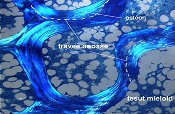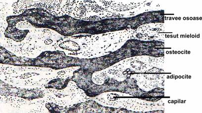 Fig. 2 Tesut osos spongios. Traveele osoase se anastomozeaza delimitand spatii largi ocupate cu tesut mieloid