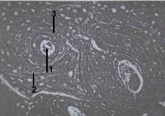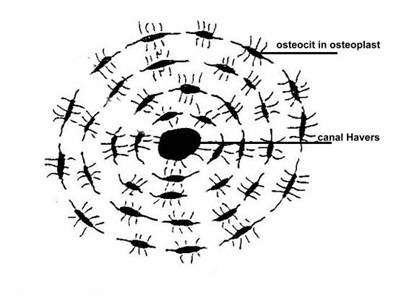 Fig. 4 Osteon. (schema generala) Central se identifica canalul Havers, iar in jur dispuse concentric se remarca lamelele osoase si invariabil incluzand osteoplastele care au continut osteocitele.