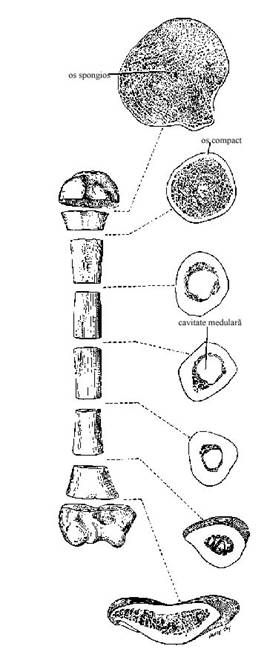 Figura 1 Exemplu de os lung - umarul, reprezentand tesut osos spongios, compact, epifiza, diafiza, metafiza si canalul medular