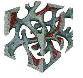 Oasele spongioase mai cunoscute ca oase trabeculare. Matricea structurala osoasa plata este de lonjeron cu maduva in spatiul intermediar (figura 6). Structura lonjeroanelor depinde de locatia lor si de situatia existenta. Lonjeroanele spongioase au, de obicei, 150300 m diametru si forma tridimensionala cu structura reticulara, cu rezistenta optima a raportului de greutate in oasele sanatoase.