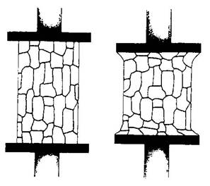 Efectul asupra tipurilor de marimi a fost cel mai temeinic examinat pe oasele trabeculare sub o forta de compresiune. Astfel, esantioanele scurte au fost gasite ca produc reducerea valorilor rigiditatii cand sunt incercate. Oasele trabeculare, ca celelalte celule solide, nu au suportat pana la sfarsit suprafata esantionului (figura 16). Deformatia de la sfarsit, sub o sarcina, va rezulta, cu o supraestimare a deformatiei pentru forta data, rezultand o subestimare a rigiditatii. Lungimea cea mai buna a proportiei esantionului a ocupat, la sfarsit, cea mai buna subestimare a rigiditatii esantionului.