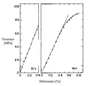 Figura 17 Comparatia curbelor de tensiune si deformatie obtinute prin incercarea oaselor umede si uscate