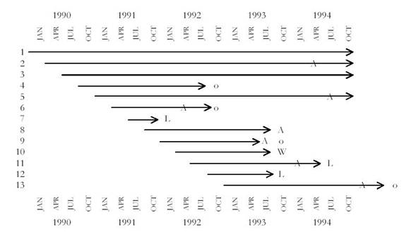 Grafic ipotetic al urmaririi a 13 pacienti pentru boala Alzheimer care au primit ingrijiri la domiciliu intre ianuarie 1990 si decembrie 1993 si urmariti pana la 31 decembrie 1994 pentru admiterea intr-un azil de batrani,