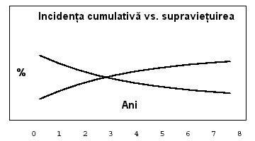 In figura de mai jos este aratata relatia inversa dintre Incidenta Cumulativa si proportia persoanelor neafectate (supravietuirea).