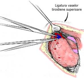 se aplica trei pense curbe pe vasele tiroidiene superioare, apoi se sectioneaza lasand o pensa spre tiroida si doua pense spre vase; se prefera dubla ligatura, cu fir neresorbabil;