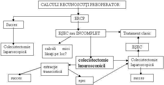 In aceste conditii, efectuarea ca prima etapa diagnostica - si terapeutica - a ERCP este justificata. Cand colangiografia retrograda infirma prezenta calculilor sau cand, in cazul in care acestia sunt prezenti, reuseste indepartarea lor, atunci colecistectomia laparoscopica poate fi realizata, fara a mai fi necesara colangiografia intraoperatorie.