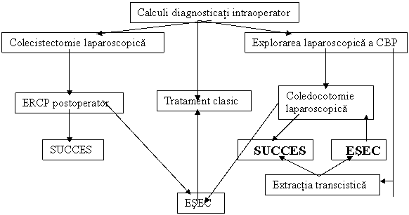 Intr-un studiu pe 612 pacienti, Michel [11] relateaza o rata de succes a tratamentului laparoscopic al coledocolitiazei de 80% (rata de succes a abordului transcistic fiind de 58,4% si a coledocotomiei primare de 82%). Extragerea transcistica a avut o durata mai mica, dar tendinta a fost spre cresterea frecventei abordului prin coledocotomie.