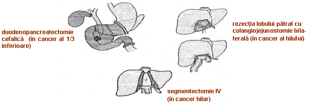 - in cancerele mijlocii: exereza larga cu chiuretaj ganglionar in bloc al pediculului hepatic si colecistectomie; transele de sectiune se verifica prin biopsie extemporanee;