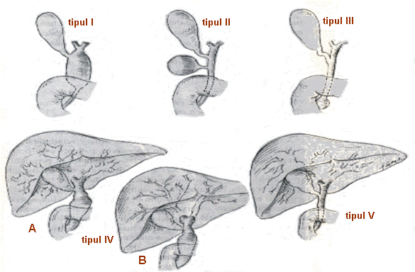 - tipul V (boala Caroli): dilatatii difuze, multiple ale cailor biliare intrahepatice (boala autosomal-recesiva cu potential de degenerare maligna, manifestata prin colangita recurenta fara icter).