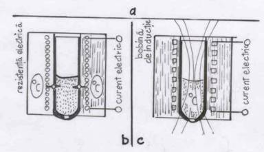 Topirea electrica. Are marele avantaj al unui control riguros si permanent in ce priveste temperatura dezvoltata. Permite topirea aliajului in atmosfera de gaze inerte (heliu, argon, xenon), facand imposibila degradarea acestuia prin oxidare. Topirea curenta a aliajului se face intr-un creuzet din material refractar (in afara palniei de turnare a tiparului). Curentul electric poate dezvolta temperatura de 15000 C, folosind-se efectul lui Joulle-Lentz. Curentul electric de inalta frecventa (CIF) este folosit ca sursa de energie la aparatele moderne de turnat dezvoltand o temperatura de 30000C, (figura 39)