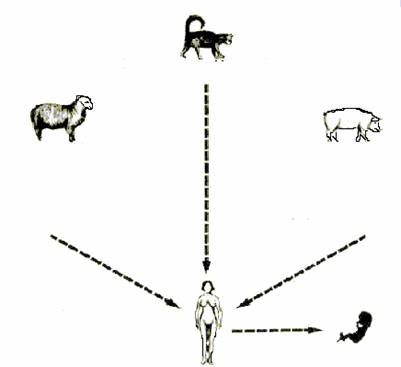Ciclul se reia atunci cand o alta gazda intermediara sau o gazda definitiva consuma carne sau alte tesuturi cu chisti.