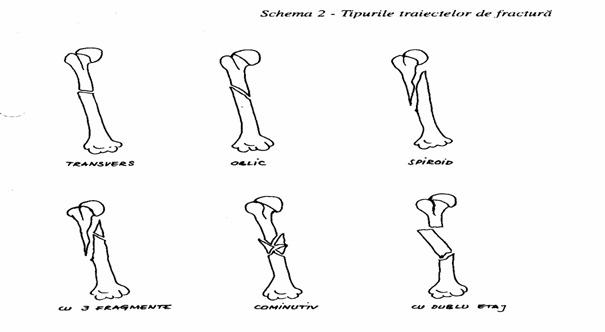 Traiectul de fractura este frecvent transversal sau oblic scurt. Pot fi si fracturi spiroide, cominutive sau in dublu etaj.