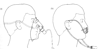(a) - oxigenoterapie cu masca; (b) - oxigenoterapie pe sonda nazala