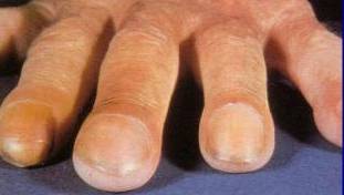 Se caracterizeaza printr-o largire si bombare a unghiilor in toate sensurile ,luand forma unei sticle de ceasornic .Acest aspect se insoteste de o hipertrofie (marire de volum) a ultimei falange ,formand in ansamblu alterarea denumita ,,degete hipocratice" .