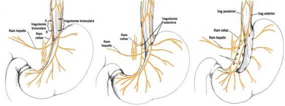 Vagotomia tronculara reprezinta interventia chirurgicala prin care se rezeca segmentul troncular al nervilor vagi in regiunea esofagiana inferioara, inainte de ramificare (Fig. 1). Vagotomia selectiva consta in sectionarea fibrelor vagale destinate exclusiv stomacului conservand inervatia vagala a restului tubului digestiv (Fig. 2).