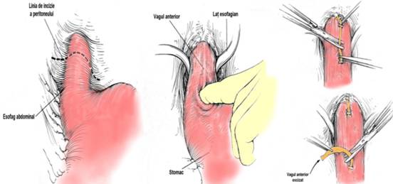 Se sectioneaza peritoneul pe fata anterioara a esofagului, cu atentie la hemostaza, si se decoleaza cu o compresa foita peritoneala. Se vizualizeaza trunchiul vagal anterior care, la palpare, seamana cu o coarda de chitara. Cu o pensa fina lunga se incarca trunchiul sau ramurile vagului anterior, care se sectioneaza cu ligatura prealabila.