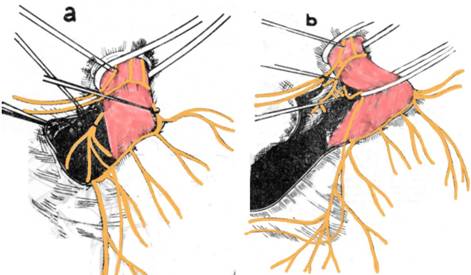 Fig. 8 - Vagotomie selectiva: a. vagul anterior este tras spre dreapta; protejand ramul hepatic se rezeca pe o distanta de 5-7 cm nervul anterior Latarjet si toate filetele nervoase de pe fata anterioara a esofagului, inclusiv ramul marginii stangi; b. dupa sectiunea pediculului coronar, vagul posterior este tras spre dreapta; protejand ramul celiac se sectioneaza nervul Latarjet posterior, celelalte ramuri gastrice, inclusiv "ramul criminal" Grassi