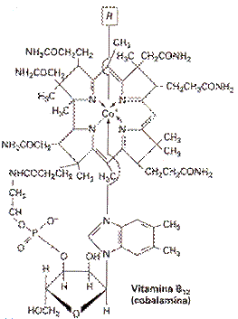Din punct de vedere chimic, vitamina B12 este formata dintr-un nucleu porfirinic ce contine central un atom de cobalt si o grupare cian.