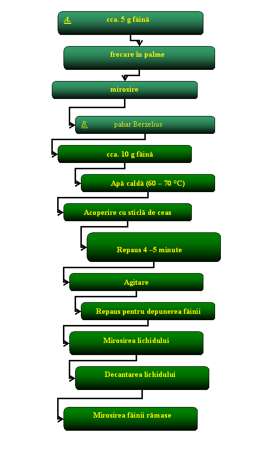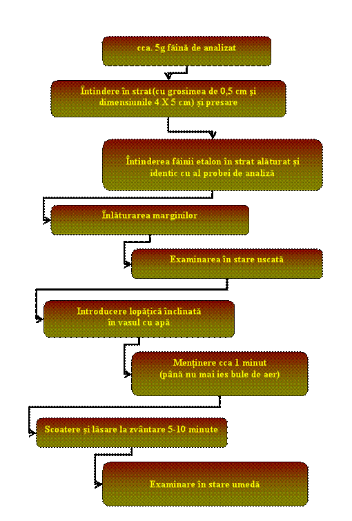 - proba de faina, faina etalon, lopatica de lemn, spaclu metalic, vas de tabla cu apa.