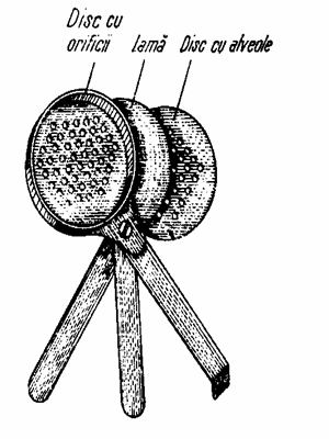 Farinotomul este alcatuit din trei discuri suprapuse, prelungite cu manere, imbinate intre ele la mijloc printr-un surub in jurul caruia pot pivota. Discul al treilea este prevazut cu 50 de alveole peste care se suprapun orificiile primului disc, iar al doilea disc este un cutit care trece printre discul de deasupra, perforat si cel cu alveole.