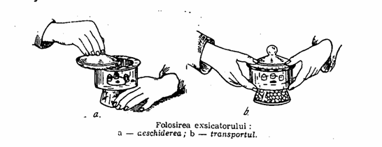 - exsicatorul este un vas mare de sticla, cu inchidere etansa, care serveste la pastrarea intr-un mediu uscat a diferitelor substante. Este format din doua parti: una superioara, cilindrica si una inferioara tronconica, cele doua parti fiind separate printr-o placa de portelan, perforata. Marginea superioara a exsicatorului este slefuita si se poate inchide cu un capac, care are si el marginea slefuita. Deschiderea si transportul exsicatorului trebuie facuta cu grija, asa cum se observa si din figura de mai jos: