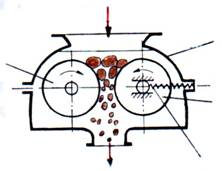 Concasorul cu cilindri este alcatuit dintr-o carcasa (1) si doi cilindri metalici (2) si (3), dintre care unul fix si altul mobil, de diametre egale care se rotesc in sens de intampinare. Materialul ce urmeaza sa fie maruntit, intra pe la partea superioara si este strivit intre cei doi cilindri. Gradul de maruntire depinde de distanta, dintre cei doi cilindri si poate fi reglata cu ajutorul lagarelor ce sustin cilindrul (2).Arcul (4) mentine intotdeauna cilindrii apropiati, iar daca intre cilindri patrunde un material cu duritate ridicata care nu poate fi sfaramat, arcul permite cilindrului sa se departeze si astfel concasorul este protejat impotriva blocarilor, socurilor si a unei uzuri rapide. Cand se sfarama materiale cu duritate mare se folosesc cilindrii cu suprafata neteda, iar cand se sfarama materiale cu duritate mica, cilindrii striati.