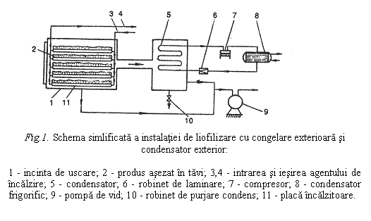 Instalatiile cu congelare exterioara si condensator exterior sunt cu functionare discontinua (fig. 1.), caz in care sunt prevazute cu un singur condensator sau semicontinua, caz in care incinta de criodesicare este prevazuta cu doua condensatoare. Incintele de liofilizare au volume mai mici decat in cazul precedent. Acest tip de instalatii necesita o camera sau un tunel de congelare sau un aparat de congelare pe banda si poate fi precedat de o camera de lucru racita. Poate fi utilizat atat pentru produsele cu textura cat si pentru produsele lichide sau pastoase, maruntite dupa congelare. Avantajul acestor instalatii de liofilizare, cu un sistem de condensare a vaporilor sublimati bine conceput este acela de a permite functionarea semicontinua. Dezavantajul principal il constituie necesitatea manipularii produselor congelate, fapt care poate antrena uneori inceputuri de decongelari ale produselor la introducerea lor in incinta de criodesicare.