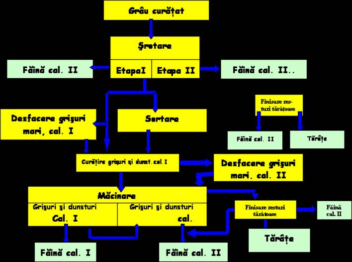 Prelucrarea graului se desfasoara dupa o schema de sfaramare treptata, din utilaj in utilaj, a bobului de grau si a sfaramaturilor rezultate din el. Fiecare faza de sfaramare este urmata de o faza de sortare prin cernere deoarece, in procesul de sfaramare, rezulta o gama variata ca marime de sparturi de bob. Prin cernere se obtin cateva grupe de particule care, in functie de marimea lor, sunt dirijate separat pentru prelucrare, cu exceptia fractiunii de faina care se dirijeaza la depozit.
