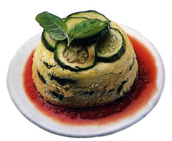 Ingrediente (pentru 6 persoane): 3 dovlecei, 2 linguri de untdelemn de masline, 4 oua, 250 ml smantana, 1 lingura de piper verde, 50 g cascaval ras, cimbru, sare, piper negru, o bucatica de unt. Mod de preparare: Curatati dovleceii de coaja si taiati-i in rondele. Incingeti 2 linguri de untdelemn intr-o tigaie si prajiti dovleceii la foc mic. - Bateti ouale cu smantana, piperul verde, cascavalul ras, cimbrul tocat, sarea, piperul negru. - Ungeti cu unt sase castronele (boluri) egale, tapetati-le cu feliile de dovlecei, iar in mijloc puneti preparatul din oua. Varati-le la cuptor, pe baie de aburi, vreme de 25 de minute. Serviti flanurile caldute, insotite de o salata de rosii, asezonate cu 2-3 picaturi de Tabasco (sos iute).