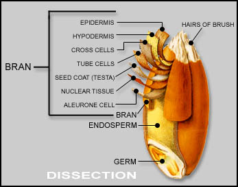 Daca se face o sectiune transversala prin bobul de grau se observa urmatoarele parti: