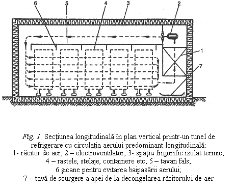 In cazul circulatiei predominant longitudinala, racitorul de aer 1 poate fi montat la un capat al tunelului (v. fig. 8.1), deasupra tavenului fals 5, sau pe peretele lateral in lungul tunelului, in acest din urma caz circulatia longitudinala a aerului realizandu-se in plan orizontal (in locul tavanului fals fiind prevazut un perete lateral fals). Ventilatorul 2 aspira aerul din tunel, il trece peste racitor si-l trimite in tunel prin gura de refulare amplasata la capatul opus, dupa ce aerul parcurge canalul format de planseul tunelului si tavanul fals 5. Aerul trece printre produsele 4 asezate pe rastele, carucioare sau suspendate pe carlige agatate de linii aeriene. Aerul parcurge astfel tunelul de-a lungul lui si pentru o mai intensa spalare cu aer a produselor, se monteaza, uneori, sicanele 6.