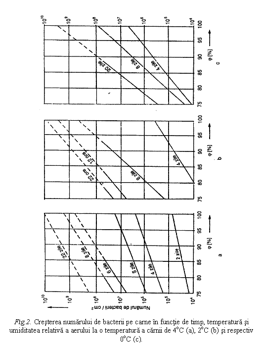 Pentru un acelasi produs, nivelul temperaturii aerului la depozitare in stare refrigerata este influentata de durata depozitarii. Durate mai mari de depozitare necesita temperaturi mai scazute de depozitare. Spre exemplificare, in fig. 2., sunt ilustrate incarcaturile microbiologice exprimate in mii de bacterii pe un cm2 de carne in functie de perioada de depozitare la diferite umiditati ale aerului si la temperaturi ale aerului de 4C, 2C si 0C. Se observa, de exemplu, ca pentru umiditatea relativa a aerului de 95% si la o temperatura de 0C in aer, numarul de bacterii pe cm2 de carne este de cca 107 dupa 8 zile de depozitare, in timp ce la o temperatura de 4C numarul bacteriilor atinge aproape 109 dupa aceeasi perioada, adica de cca 100 ori mai multe.