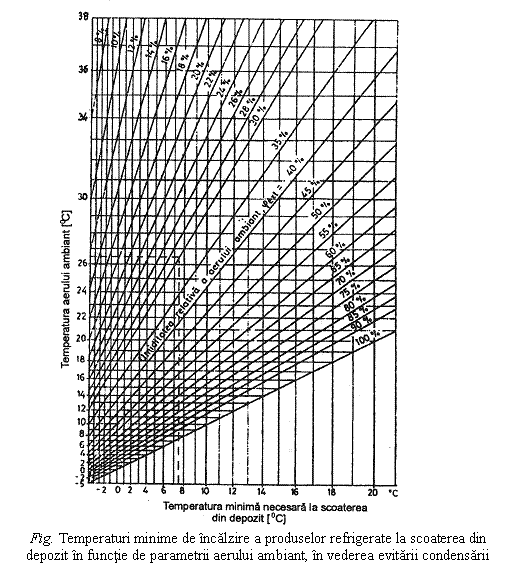 Pentru prevenirea condensarii pe produse a vaporilor de apa din aer la scoaterea din depozite este recomandabila, in unele cazuri, operatia denumita temperare. Aceasta operatie consta in incalzirea partiala a produselor refrigerate inainte de a veni in contact cu aerul exterior, pana cand temperatura suprafetei lor creste peste temperatura punctului de roua al aerului exterior. In functie de durata in care produsele scoase din depozite vor sta in contact cu aerul exterior, de natura produselor, de dimensiunile acestora si de intensitatea circulatiei aerului exterior peste produse, temperarea se face pana la o anumita temperatura peste cea a punctului de roua al aerului exterior. Orientativ, in fig. sunt redate temperaturile minime pana la care trebuiesc incalzite produsele scoase din depozit pentru a se preveni condensarea in functie de temperatura si umiditatea relativa a aerului exterior.