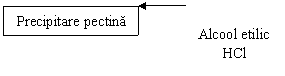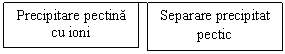 - precipitarea cu ioni polivalenti, care se face direct pe extractele pectice neconcentrate, la pH 3,6 - 3,7 si la temperatura de 30oC. Coagulul obtinut se spala cu un amestec de alcool si acid clorhidric pentru indepartarea completa a ionului metalic din coagul. Lichidele de spalare se separa din coagul prin centrifugare, iar alcoolul se recupereaza.
