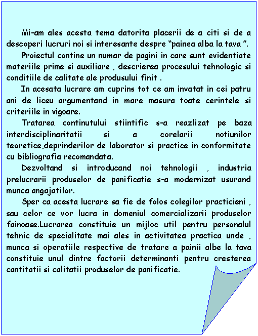 COLEGIUL TEHNIC DE INDUSTRIE ALIMENTARA « DUMITRU MOTOC BUCURESTI» PROIECT DE DIPLOMA TEMA PROIECTULUI : TEHNOLOGIA FABRICARII 'PAINII ALBE LA TAVACiteste tot ... 8699 cuvinte