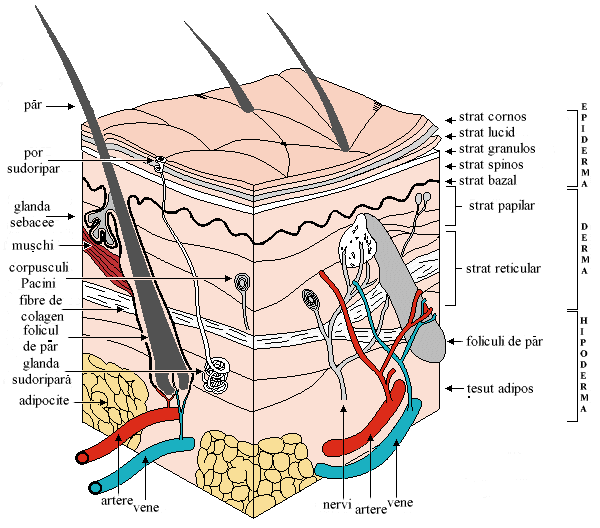 Hipodermul            Hipodermul este stratul profound al pielii ,situat sub derm si care se continua cu aponevrozele subiacente sau cu periostul oaselor .Spre deosebire de derm ,care este format dintr-un tesut conjunctiv dens