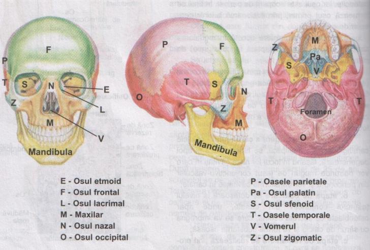 SCHELETUL CAPULUI Este format din 22 de oase si este impartit in: neurocraniu, format din 8 oase (frontal, parietale, temporale, occipital, etmoid si sfenoid), si viscerocraniu, format din 14 oase, 2 nepereche (vomerul si mandibula) si 6 pe