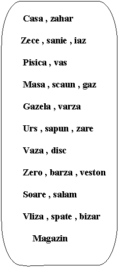 muzica , ocazie , perfuzie , propozitie , urzica , uzina , vizita , buldozer , jaluzele , amiaza , batoza , mazare , dormeza , pauza , proteza , razatoare , repriza , valiza , viteza , crizantema , difuzor , prizonier , rezolvat;
