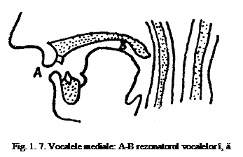 La vocalele mediale (fig. 7), dosul limbii se retrage putin spre partea posterioara a palatului, prelungind astfel rezonatorul in care va intra si partea mediala a limbii si a palatului. Astfel se formeaza vocalele i, a.